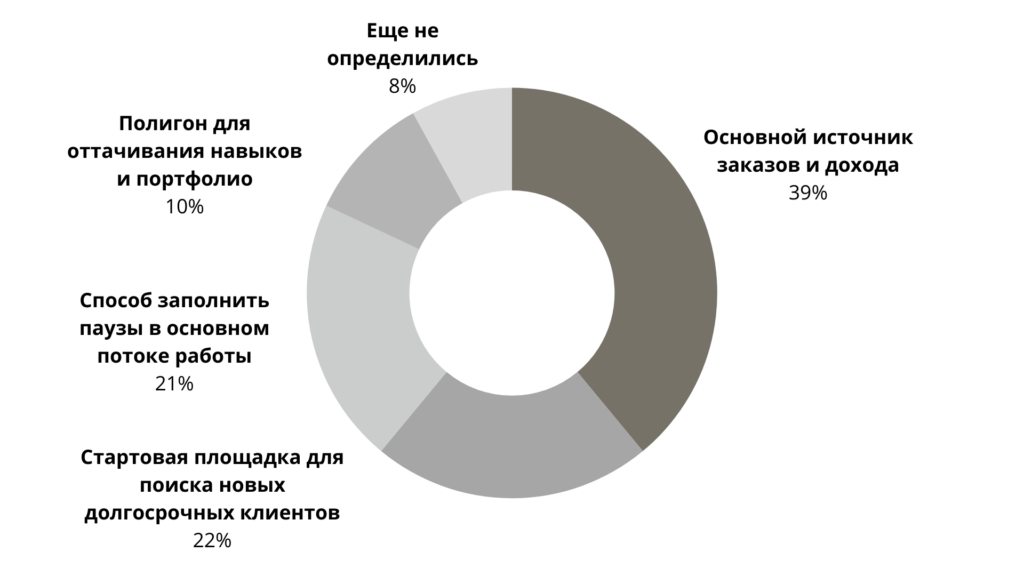 Еще для 22% это стартовая площадка для поиска долгосрочных клиентов, для 21% – способ заполнять паузы в основном потоке. Платформа становится инфраструктурой: от первых заказов до стабильной клиентской базы.