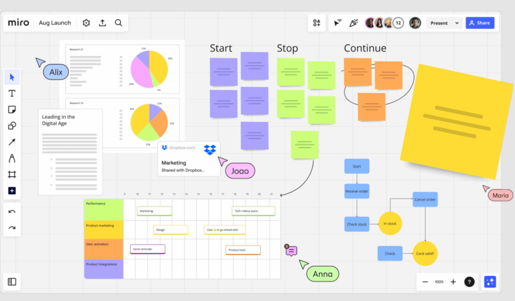 Если вы объясняете клиенту процессы, стратегию, систему или этапы работы – Miro просто незаменим. Это онлайн-доска для визуализации идей, процессов, стратегий, карт и схем. Подходит для совместной работы с заказчиком.