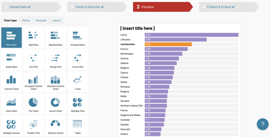 Если вам нужно сделать аккуратные, минималистичные и понятные графики, а навыков аналитика нет – Datawrapper ваш выбор. Сервис позволяет создавать диаграммы, столбчатые графики, карты и таблицы, которые легко читать и удобно встраивать на сайты или в презентации.