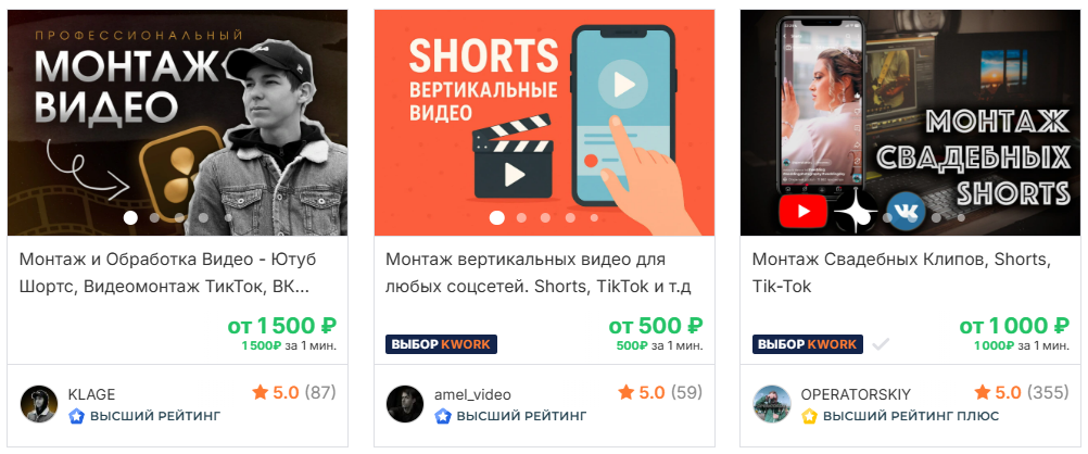 - Ищем исполнителя. В поиске Kwork введите запрос «создание контента», «съемка видео для соцсетей», «монтаж вертикальных видео» – в зависимости от ваших потребностей. Или сразу создайте готовый проект на Бирже – фрилансеры, готовые выполнить вашу задачу, будут откликаться на задание, а вам останется только выбрать из заинтересованных продавцов. Просмотрите услуги исполнителей, воспользуйтесь фильтрами поиска по цене и срокам выполнения заказа. Обязательно изучите портфолио – вам нужны живые, динамичные работы.