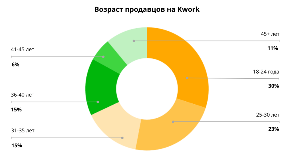 В ноябре этого года аналитики отметили, что количество фрилансеров в возрасте старше 45 лет в России увеличилось на 9%. На Kwork мы заметили ту же тенденцию: доля исполнителей 45+ среди опрошенных продавцов увеличилась – если в прошлом году их было 7%, то в этом уже 11%. Это подтверждает, что фриланс становится все более привлекательной и комфортной средой для опытных профессионалов, которые ценят возможность монетизировать свой многолетний опыт.