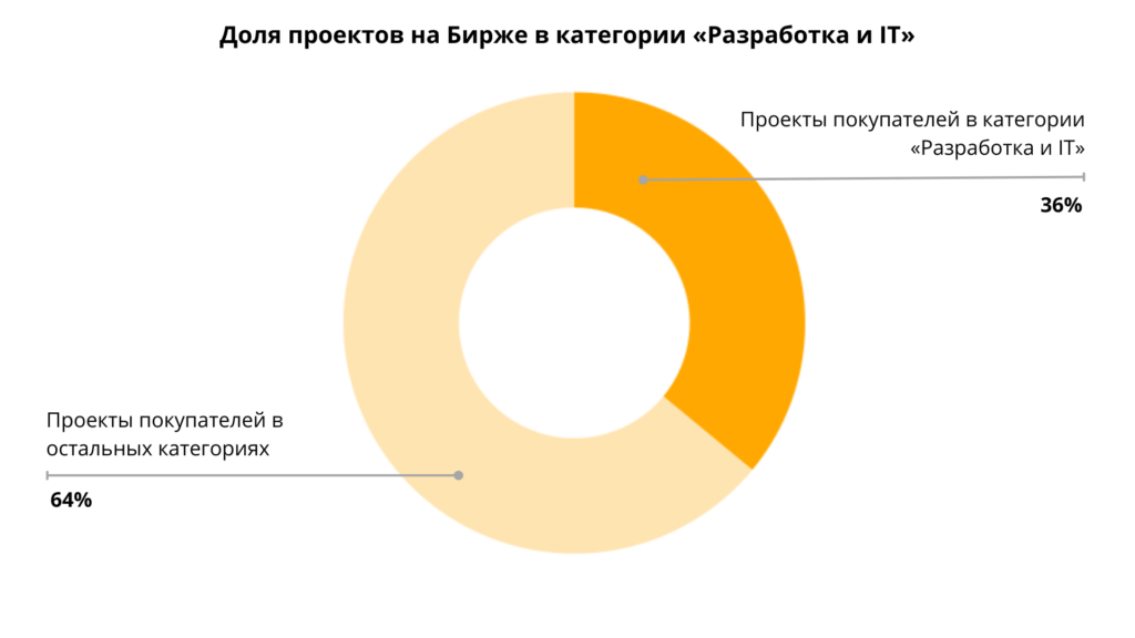 - Ежемесячно на Бирже Kwork в категории «Разработка и IT» размещалось в среднем 5620 проектов – 36% от общего среднего числа проектов за месяц. Такой стабильно высокий спрос на решение IT-задач указывает на системный, а не разовый, характер стремления покупателей к гибкости.