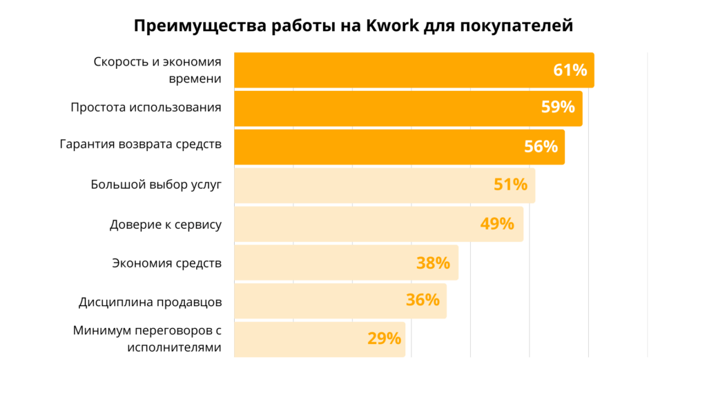 - Простоте использования (59%) – покупателю не нужно быть экспертом в найме, чтобы получить результат – Kwork берет на себя всю организационную логистику.