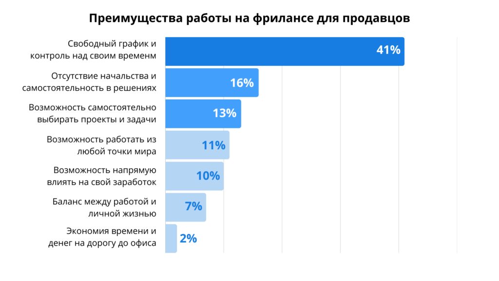 Для продавцов самым главным преимуществом фриланса является свободный график и контроль над своим временем – так ответили 41% исполнителей. При этом для 45% опрошенных продавцов плюсов на фрилансе больше, а для 44% – плюсов и минусов в такой работе поровну.