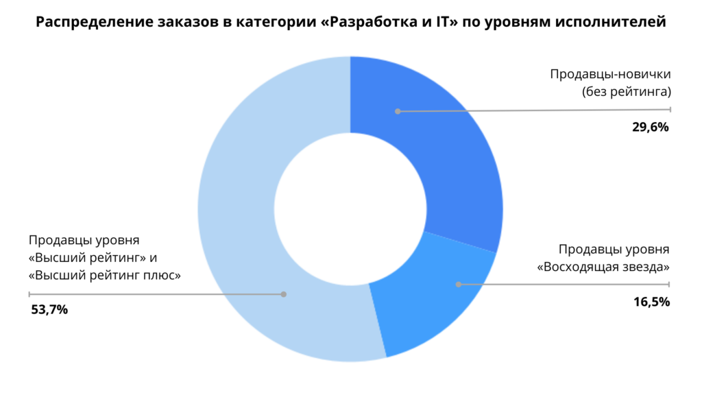 3. Спрос на опытных IT-фрилансеров остается стабильно высоким: продавцы, имеющие статус «Высший рейтинг» и «Высший рейтинг плюс» в 2025 году выполняли в среднем 53,7% от всех заказов в категории в месяц.