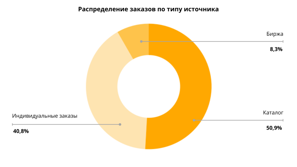 - Канал поиска. Хотя быстрый поиск решений через каталог кворков остается самым популярным (50,9% заказов), не менее значительная доля приходится на индивидуальные заказы – 40,8%. По сравнению с прошлым годом количество таких заказов увеличилось на 1,6%.