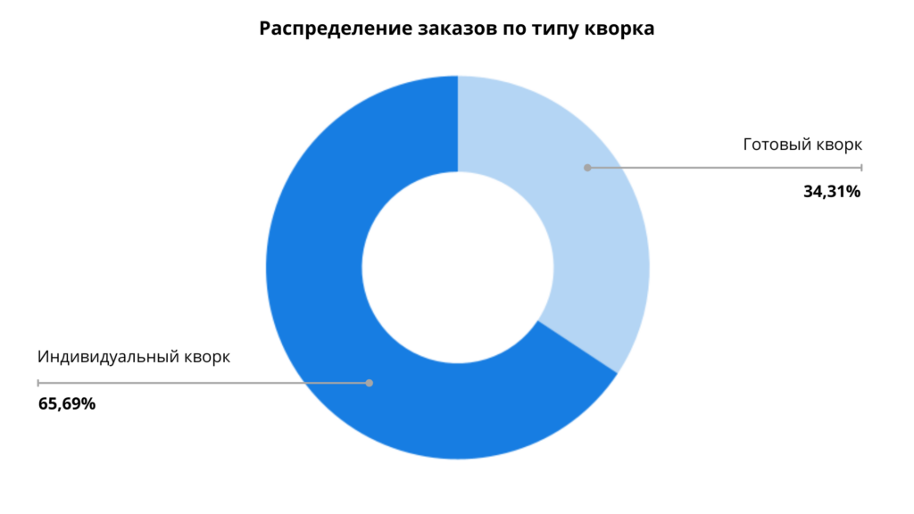 - Тип услуги. Этот сдвиг напрямую подтверждается предпочтениями по типу кворка: покупатели все чаще выбирают кастомные услуги, созданные специально под их задачу, – 65,6% заказов против 34,3% заказов готовых услуг.