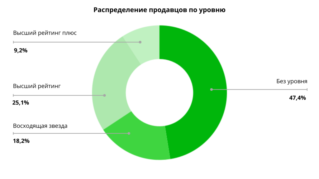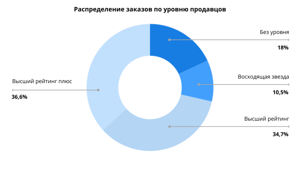 - Репутация конвертируется в заказы: на долю продавцов высших уровней приходится 71,4% всех заказов на платформе. Вывод очевиден: инвестиции в репутацию и качество дают многократную отдачу.