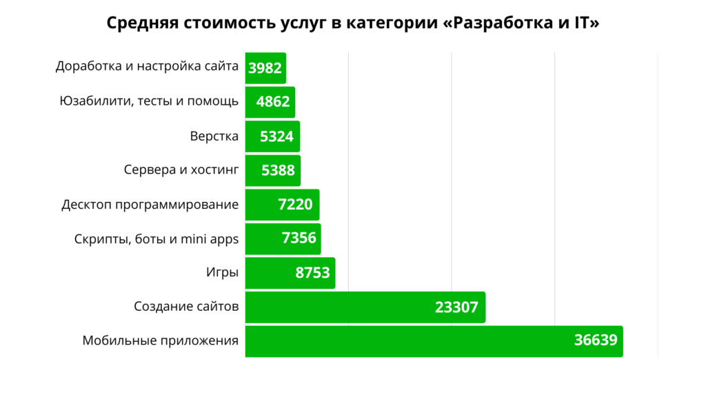 - Средняя стоимость услуг в категории «Разработка и IT» составляет от 3 982 до 36 639 рублей – в зависимости от задачи, ее сложности и объема, а среднее время выполнения IT-заказов – 3 дня 15 часов. Kwork дает доступ к экспертам без содержания их в штате. Вы платите только за результат по задаче, а не за соцпакет, отпуска или периоды, когда задач у специалиста нет.