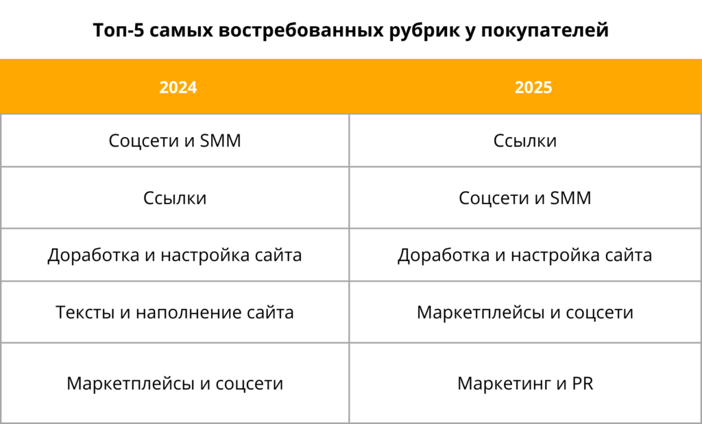 - Маркетинг и PR — новая рубрика в списке топ-5, которая сместила прошлогоднюю «Тексты и наполнение сайта». Это говорит о переходе покупательского спроса с разовых тактических задач на комплексное стратегическое планирование.