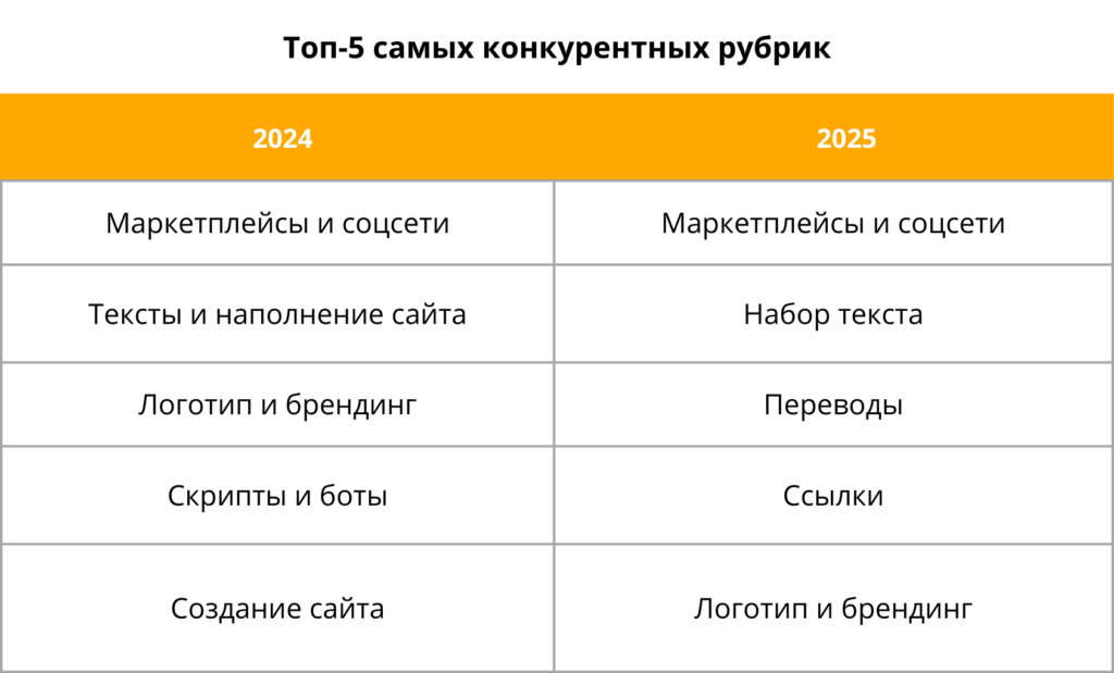 На фоне стабильно высокой конкуренции в маркетинге и дизайне произошел заметный сдвиг в сторону услуг, связанных с текстом и SEO. При этом рынок услуг по созданию сайтов и автоматизации, судя по рейтингу, стал менее конкурентным. Это отражает общие тренды цифровой экономики, где возрастает ценность контента, локализации и поискового продвижения.