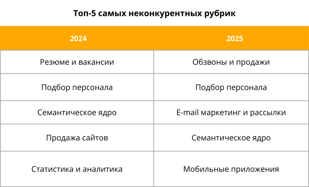 Если в 2024 году неконкурентными были в основном вспомогательные и кадровые услуги, то к 2025 году в этот список добавились разработка, стратегический маркетинг и активные продажи.